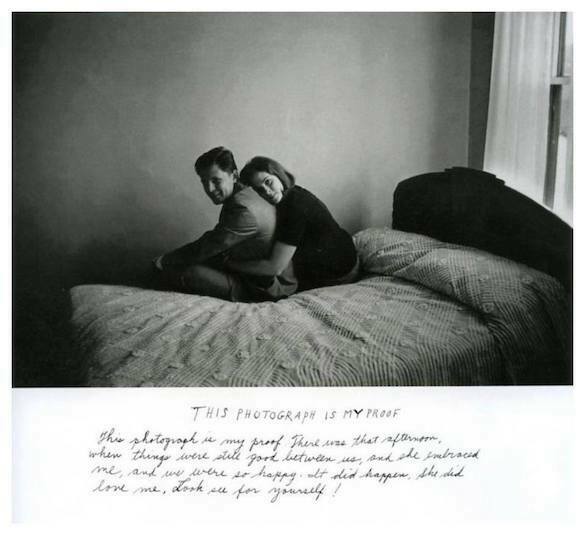 Iată, una dintre cele mai cunoscute imagini din seria “Această fotografie este dovada mea” este cea în care un cuplu stă pe un pat, într-un moment de fericire care se cerea imortalizat. Fără textul care o însoțește, ți-ai putea imagina că e doar un instantaneu dintr-o perioadă fericită a vieții lor și ai trece ușor mai departe. Puteau fi căsătoriți sau amanți, erau în vacanță sau într-o cameră oarecare de hotel pentru o oră de iubire, oricare ar fi fost situația lor, el e fericit, îmbrățișarea ei a a unei femei care iubește. Dar cu textul scris de mână nu mai poți. Te oprești și începi să faci scenarii, să derulezi povestea.