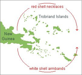 Ei pleacă regulat în călătorii de multe zile pe mare pentru a îndeplini împreună cu vecinii lor cermonii de acordare de daruri. Din timpuri imemoriale aceleaşi două tipuri de daruri, din scoici: coliere de un anumit fel şi brăţări de un anumit fel. Într-un areal de câteva zeci de mii de mile pătrate, primele călătoresc în sensul acelor de ceasornic, celelalte în sens invers. A primi un dar înseamnă a-l păstra în custodie şi a-l da, la un moment dat, mai departe, mai încărcat de istorie comunitară decât era atunci când a fost primit. Darul trebuie să circule. Posesorul curent are de plănuit cu grijă cui, când şi cum va da mai departe darul. Cel care n-a primit de mult o brăţară sau un colier aşteaptă şi se întreabă oare când, cum şi de la cine o/îl va primi. Unui dar îi ia între doi şi zece ani să facă turul arhipelagului. Reputaţia şi poziţia socială a insularului derivă din modul în care ia parte la acest schimb. Pentru trobriandezi, ceremonia darului e tratatul de bună vecinătate şi încredere mutuală cu vecinii de pe celelalte insule. Canoele care poartă brăţări sau coliere transportă şi mărfuri. Schimbul economic e posibil datorită reţelei de legături politice ţesută din daruri.