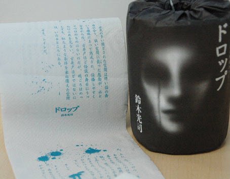 Ajunseserăm să întrebăm până și niște tipografii din China în ideea că, dacă chinezii nu fac, înseamnă că chiar nu se poate. Tot navigând în căutare de informații, am dat peste scriitorul japonez Koji Suzuki, pe unul dintre romanele căruia s-a bazat celebrul horror „The Ring”. Profitând de caracteristicile scrierii japoneze, și de dimensiunile reduse ale romanului său, Drop (2009), o altă poveste de groază, editorii s-au gândit să îl publice pe un suport non-conformist, dar care îndeamnă la lectură, în virtutea obiceiului multora dintre noi de a face mai multe lucruri în același timp, mai ales când ne ducem unde merg singuri și împărații. Pentru a citi cele nouă capitole ale cărții-sul de hârtie igienică a japonezului nu e nevoie nici de Kindle, nici de alt suport inovator, cel clasic țintuit de peretele băii fiind mai mult decât suficient.