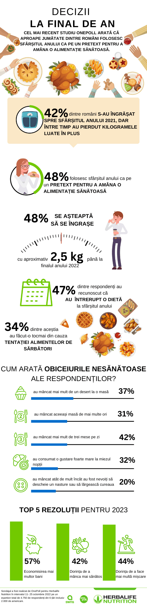 48% dintre respondenții români care au participat la sondajul realizat de OnePoll, cel de-al cincilea sondaj anual al Herbalife Nutrition intitulat „Decizii la final de an” au declarat că intenționează să își amâne obiceiurile sănătoase, recunoscând că începutul lunii decembrie este momentul marcant. Sondajul din acest an a inclus și o componentă globală: pe lângă cei 2.000 de respondenți americani, au fost chestionați și 2.750 de respondenți internaționali din cinci țări diferite, inclusiv din România, majoritatea respondenților români (47%) având vârsta cuprinsă între 26 și 41 de ani.