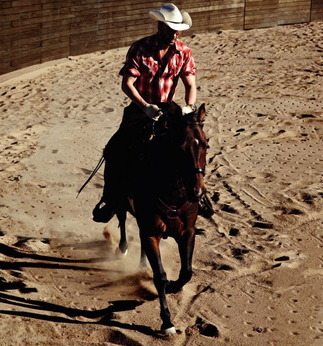 Tom Ford, recunoscut pentru discreția legată viața personală, a acceptat în decembrie 2011 vizita unei echipe de fotografi ai revistei Vogue France la ferma din New Mexico, unde își petrece cam un sfert din an. De ce o fermă în new Mexico? Născut și crescut în Austin, Texas, Tom s-a mutat cu familia, pe când avea 11 ani, în Santa Fe, iar cei 7 ani petrecuți acolo l-au crescut spiritual și i-au influențat creația de mai târziu. Ferma ocupă aproape 10 hectare din zona unde s-au turnat cândva western-urile celebre Silverado, Wyatt Earp și 3:10 to Yuma și a fost proiectată de arhitectul japonez Tadao Ando. Caii nu aveau cum lipsi din peisaj, așa încât există și facilități ecvestre, unde aceștia aș paria că se simt cel puțin la fel de bine ca și proprietarul lor. Ca să nu mai vorbim de cât de bine îi va merge aici lui Alexander John Buckley Ford, băiețelul născut pe 23 septembrie 2012, al cărui tată biologic este Tom Ford. Vă reamintesc că Tom (51 de ani) este de 26 de ani într-o relație cu Richard Buckley (64 de ani).