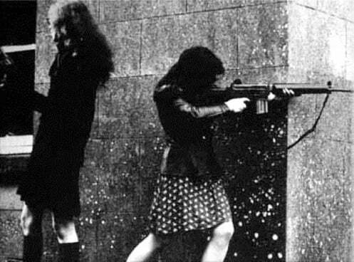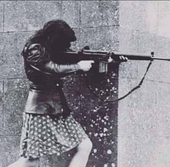 Fotografia arată așadar o femeie în acțiune care luptă trăgând cu arma de foc ca membru al unei organizații armate într-un război de eliberare națională împotriva forțelor militare străine de ocupație.