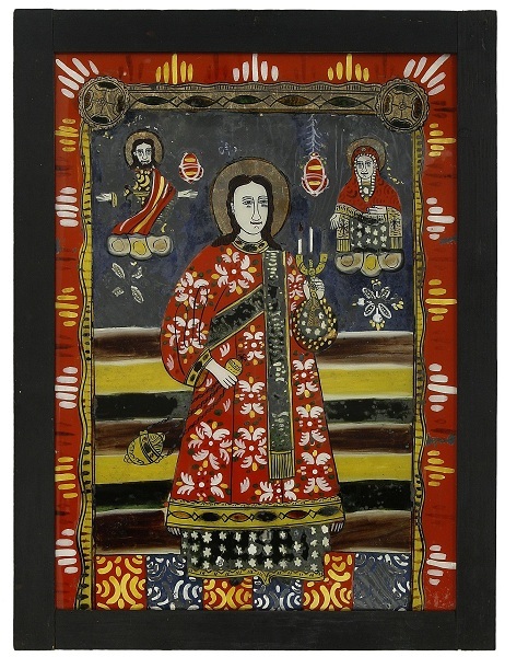 Icoană pe sticlă cu tema „Sfântul Arhidiacon Ștefan”, datare sfârșitul secolului al XIX-lea, zonă Biserica Albă, Banatul Sârbesc – Colecția Muzeului Național al Țăranului român, categoria juridică Tezaur.
