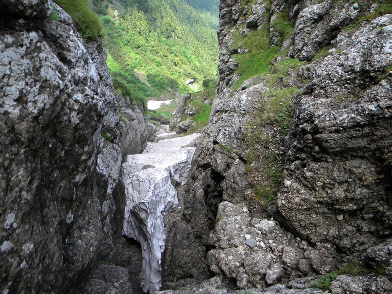 E sâmbătă, 8 iunie şi am ieşit la o tură cu un grup cu care voi merge în august pe Mont Blanc. Printre ei, sunt câţiva nu foarte obişnuiţi cu mersul pe zăpădă în colţari, aşa că alegem Valea Bucşoiului, spre vârful Omu. E vale nordică, e încă plină de zăpadă, numai bună de antrenament pentru uriaşul din Alpi. La intrarea pe vale ne întâlnim cu David Neacşu, care le dă oamenilor mei acelaşi sfat tragi-comic pe care mi l-a dat şi mie acum câţiva ani. „Aveţi grijă, dar dacă, totuşi, vreunul cade, să pună mâinile la faţă, să-l recunoască mă-sa”. Întâmplător sau nu, tocmai le povestisem faza cu David cu vreo 10 minute în urmă. Urcăm vreo 30 de minute pe stânci curate şi nişte feţe înierbate, apoi coborâm pe firul văii. Încerc zăpada. E tare, ţine, aşa că decid să nu-mi pun colţarii, pentru că vârful rigid al bocancilor mei de iarnă găseşte sprijin solid în treptele de zăpadă. După câteva sute de metri urcate, Răzvan, care era în frunte, ne strigă să ieşim în stânga, pe iarbă, pentru că valea e blocată de o săritoare prea dificilă pentru a fi trecută de toţi. Parcurgem vreo două sute de metri pe iarbă, după care revenim în vale, pe zăpadă. Slavă Domnului, nu-mi place deloc iarba asta. Făcusem schimb de locuri cu Răzvan, acum eu eram în faţă şi el în ariergardă, alături de Georgiana, pe care  o secundasem eu până atunci. Plec primul pe o pantă de vreo 50 de grade şi încep să simt zăpada altfel sub tălpile rigide ale Nordwandzilor. E mai nesigură decât mai jos, nu mai e la fel de fermă. Oare să-mi pun colţarii?