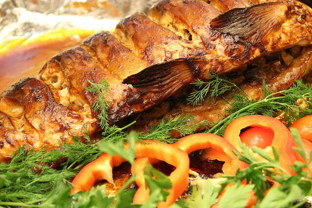 A doua reţetă se bazează pe peşte curăţat, un pahar generos de şpriţ (jumi- juma apă cu vin demi-dulce alb), boabe de piper, ienibahar, coriandru, felii de lămâie sau portocală, usturoi feliat şi câteva felii de ardei iute şi un praf de sare. Se dă la cuptor. Alcătuirea e mult mai gingaşă, merge şi aşa, şi cu un mujdei mai blând, dar şi cu lămâie. Şi e suficient de cosmopolit să permită şi pâine şi grâu bulgur fiert şi orez ca garnitură.