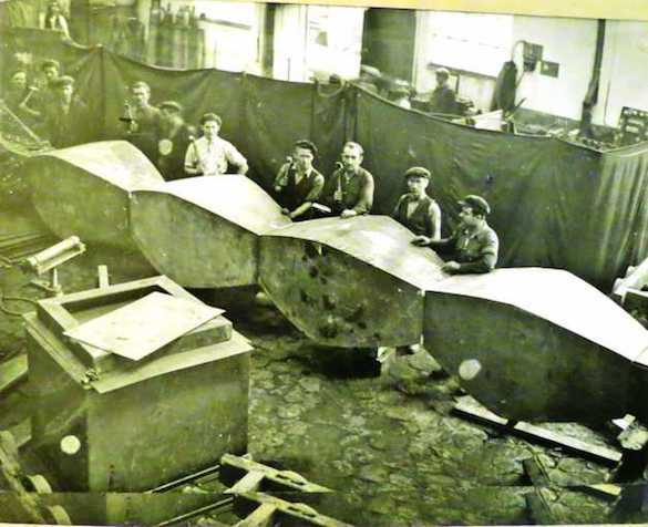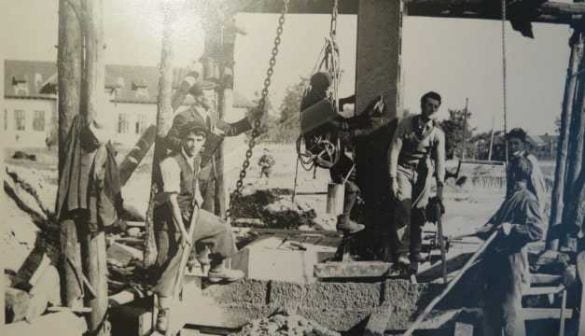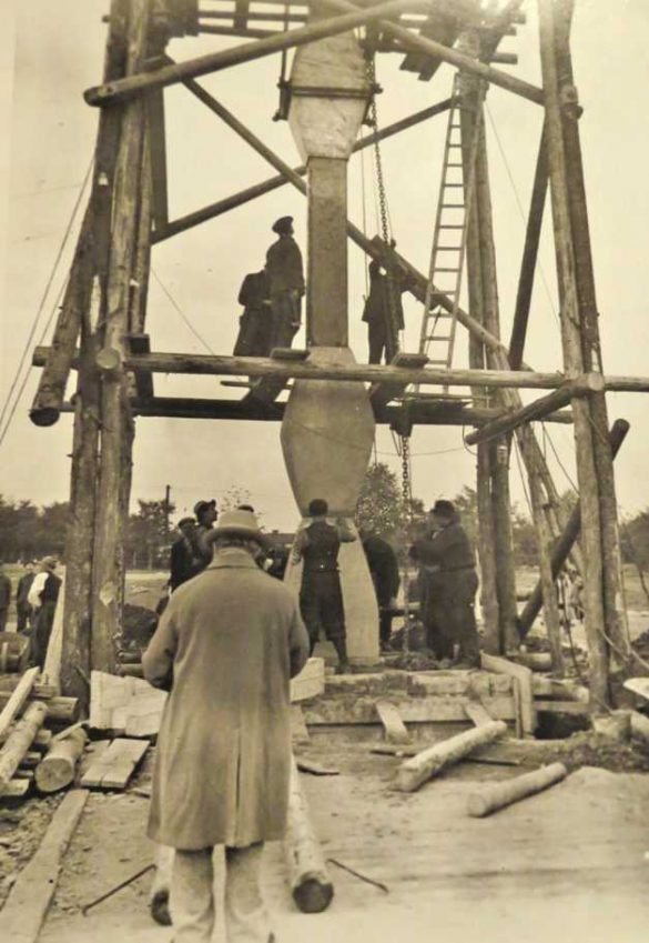 Brâncuși (cu spatele), în timpul ridicării Coloanei