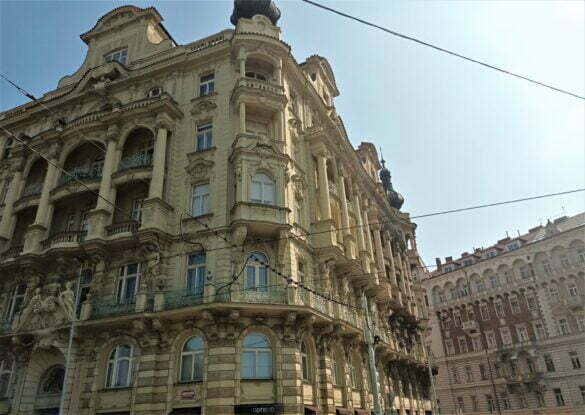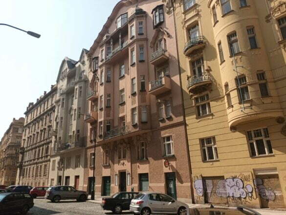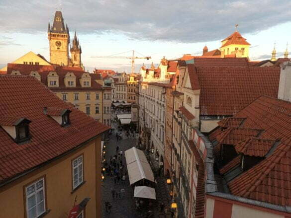 … în centrul centrului, Strada Karlova fiind cea care face legătura între Staroměstské náměstí (Piața Orașului Vechi) și Karlův most (Podul Carol), de la geamuri – etajul 4 – având permanent sub ochi piața, turlele fabuloasei Biserici a Maicii Domnului înainte de Tyn și cerul orașului Praga…