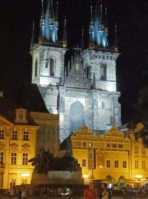 Biserica Maicii Domnului din fața Tyn (tyn-ul era o împrejmuire medievală – am săpat mult, prin patru limbi, ca să găsim explicația!) este o capodoperă gotică, biserica principală a acestei părți a orașului încă din secolul al XIV-lea. Cele două turnuri ale bisericii au o înălțime de 80 m, iar vârful fiecărui turn este înconjurat de opt turnuri mai mici în două rânduri de câte patru.